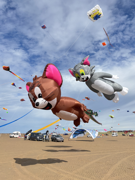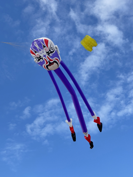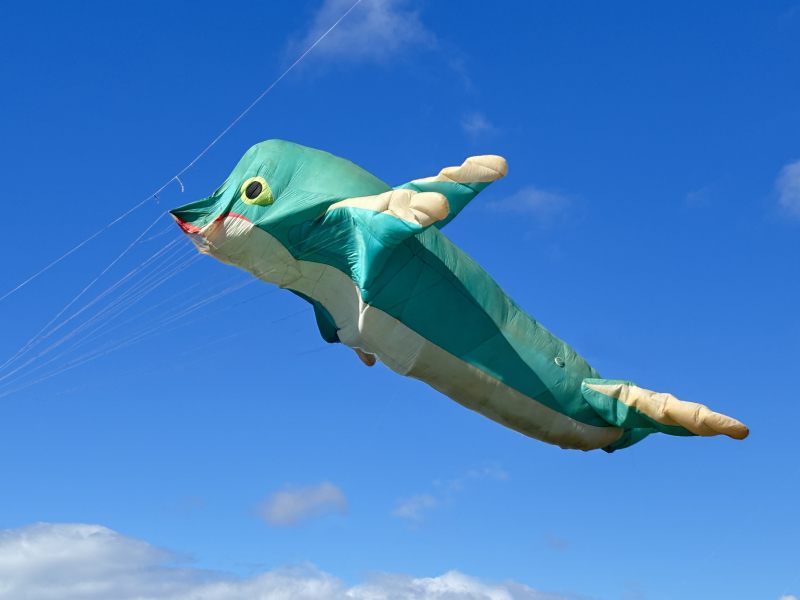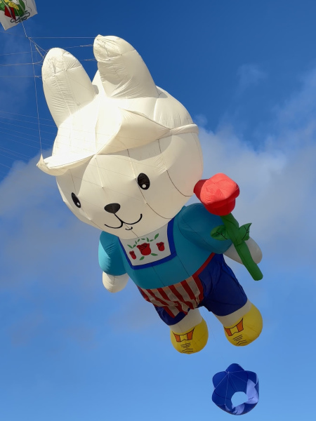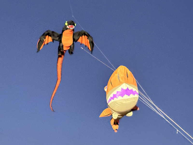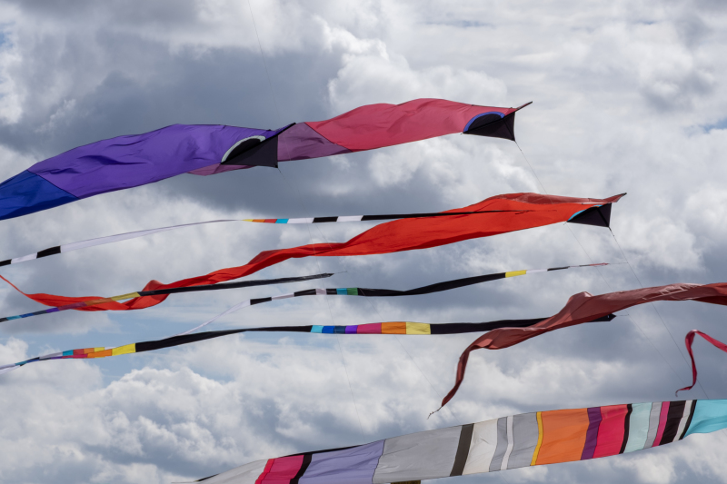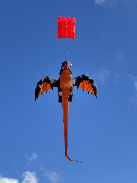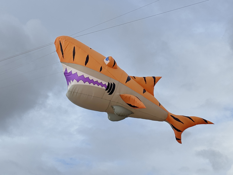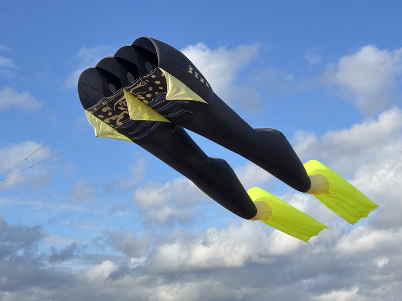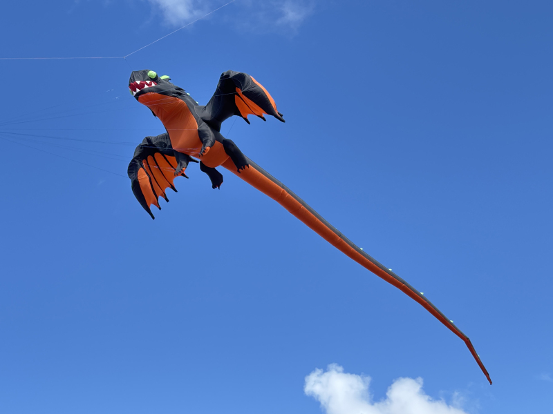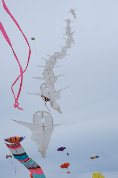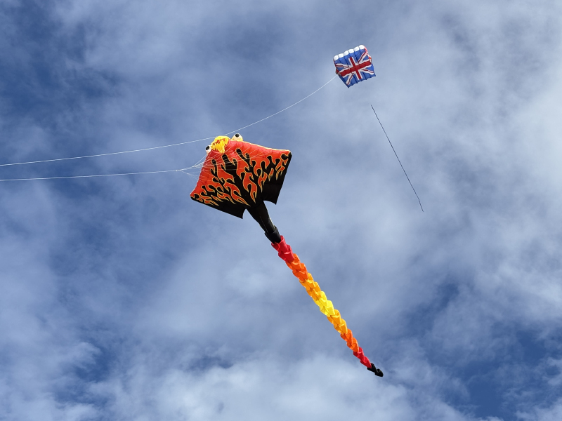 The weather on Saturday continued to bring some strong winds and with an approaching storm the flying was cut a couple of hours short in the afternoon. Still a great display was put on by everyone. Sunday’s winds were even stronger so we got our 40 and 50 metre tube tails out. We thought we were being lucky with the dark clouds travelling to our South until it suddenly changed by 90o which meant a move of the car but we continued to fly until a shout of some apparently non-existent lightning told us to take the kites down.