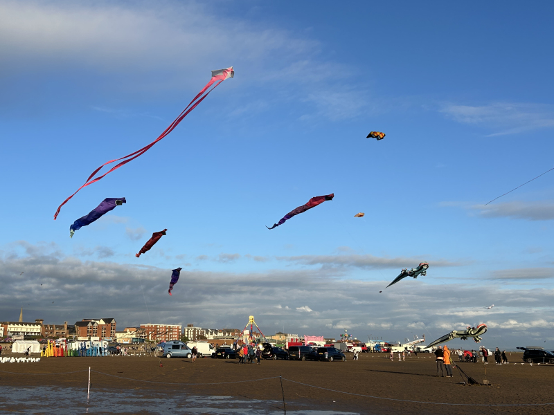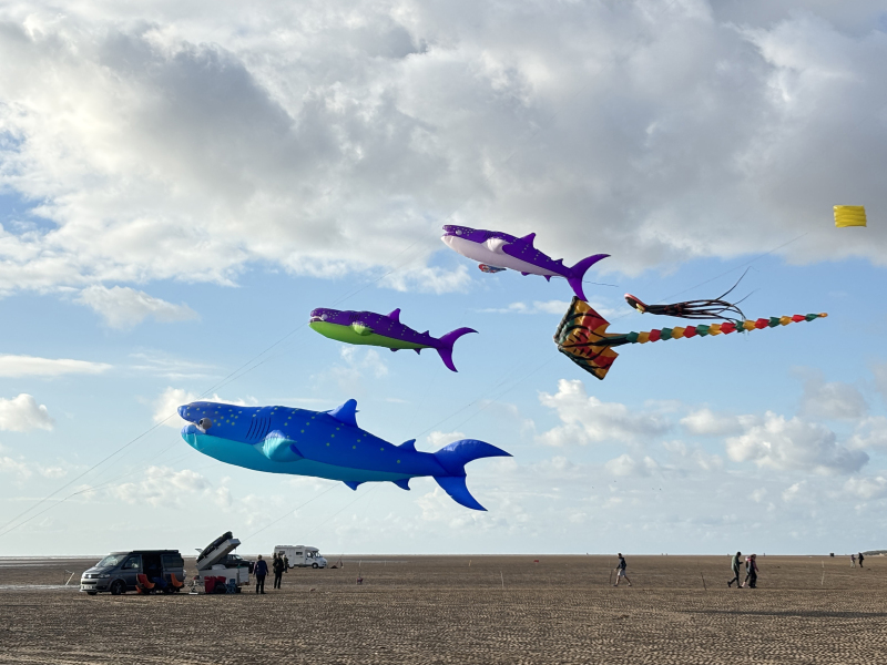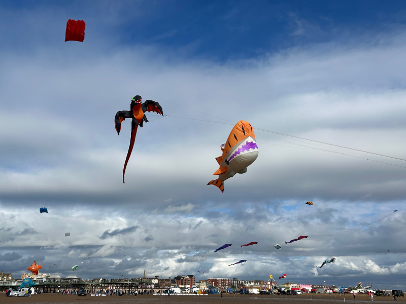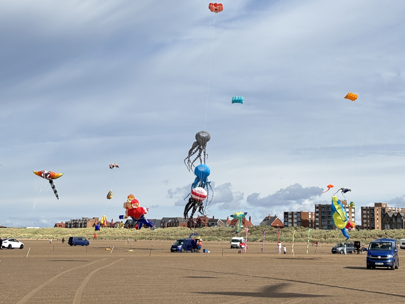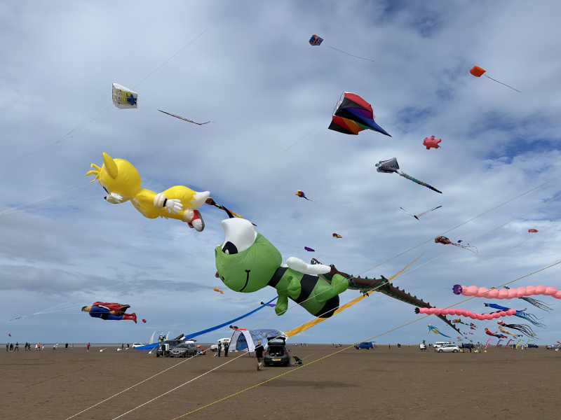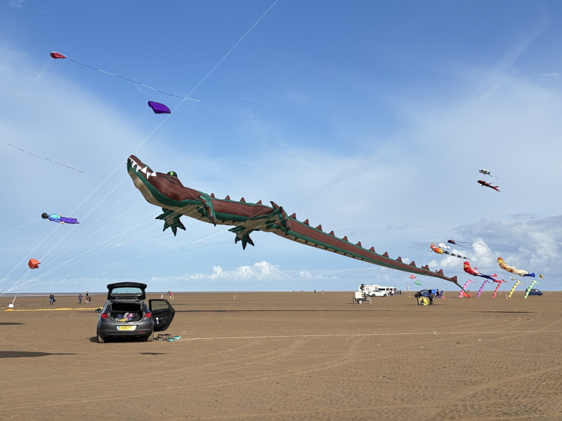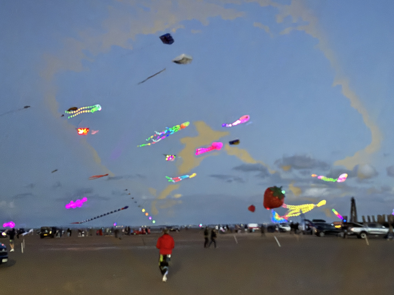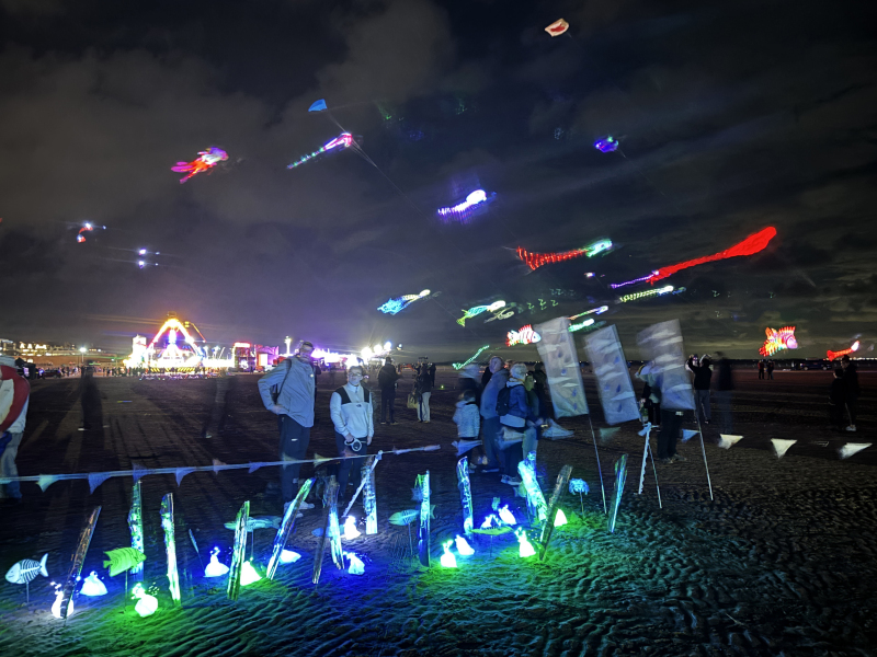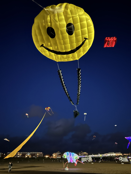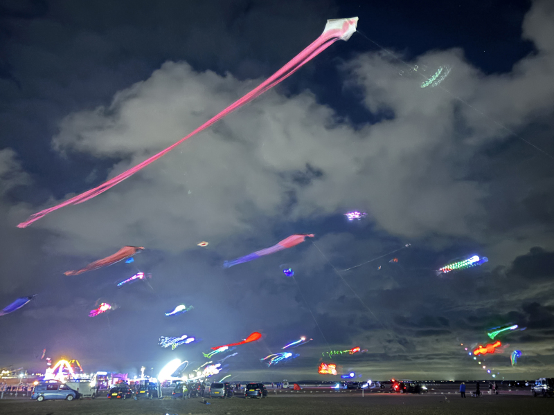 Organised by SmileFactor10, the St Anne’s International Kite Festival was held on the 29th, 30th and 31st August 2025. The festival will be remembered not just for how windy, and at times wet it was, but for the fantastic efforts of the fliers. We arrived at midday on the Friday shortly after a heavy downpour and therefore the beach looked like the tide had come in. For many, plans changed in terms of kites being flown due to the ground conditions and wind strength. When it came to the night flight the sky was filled with LED lit kites as well as some lit by the strong floodlights. Another great night fly.
