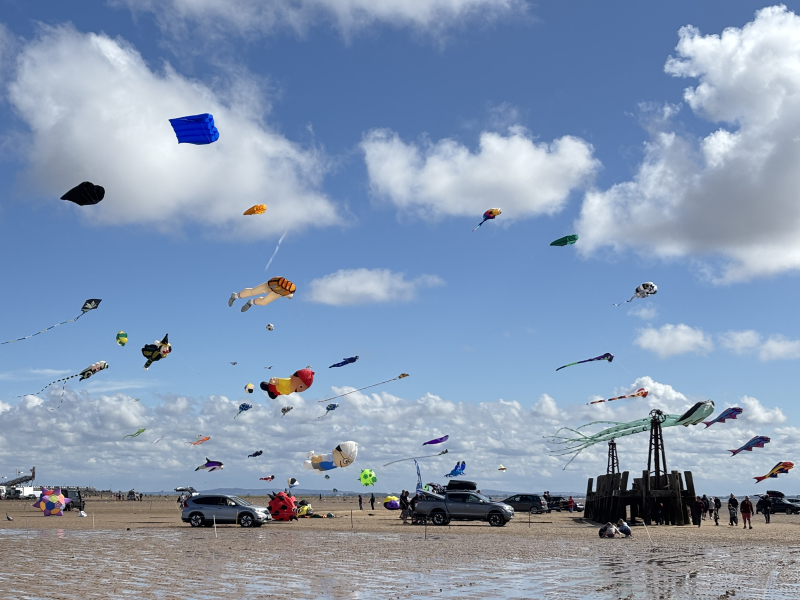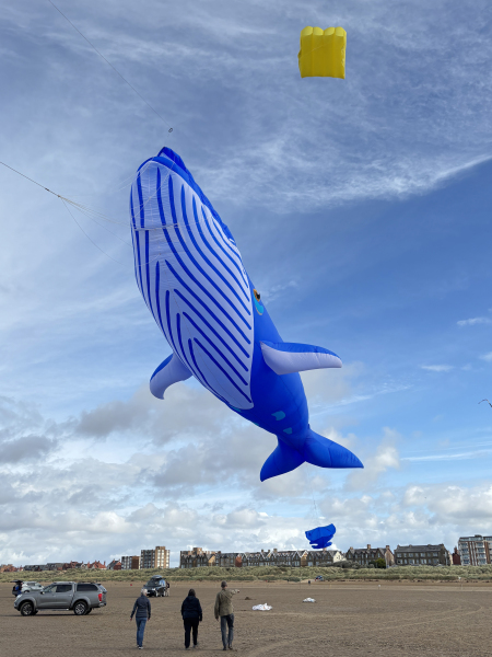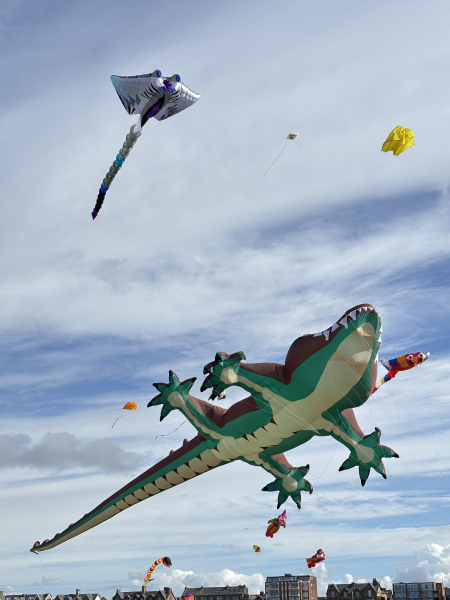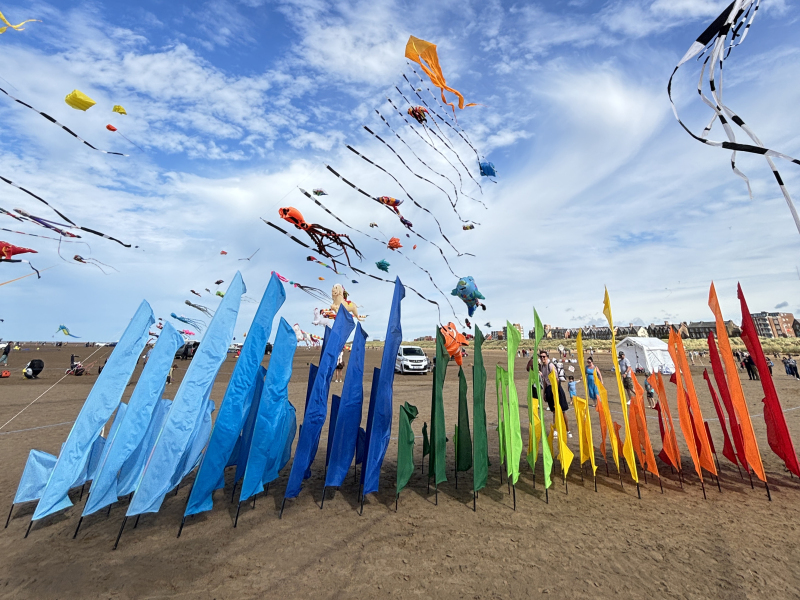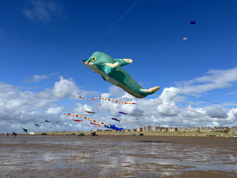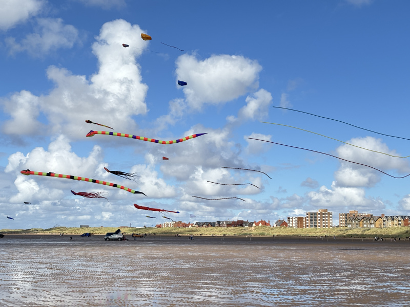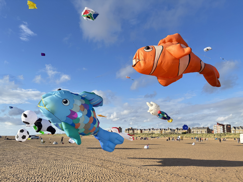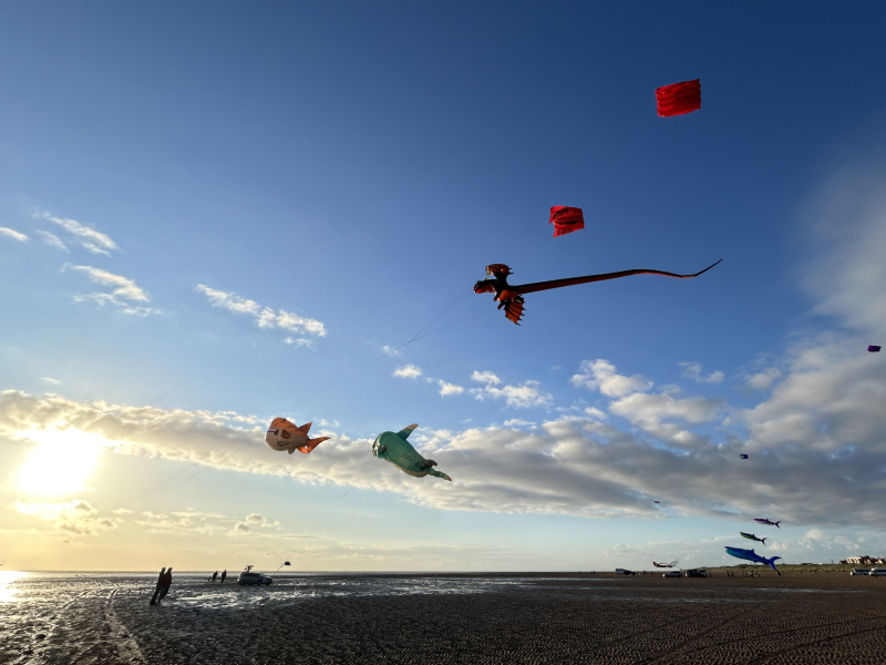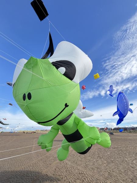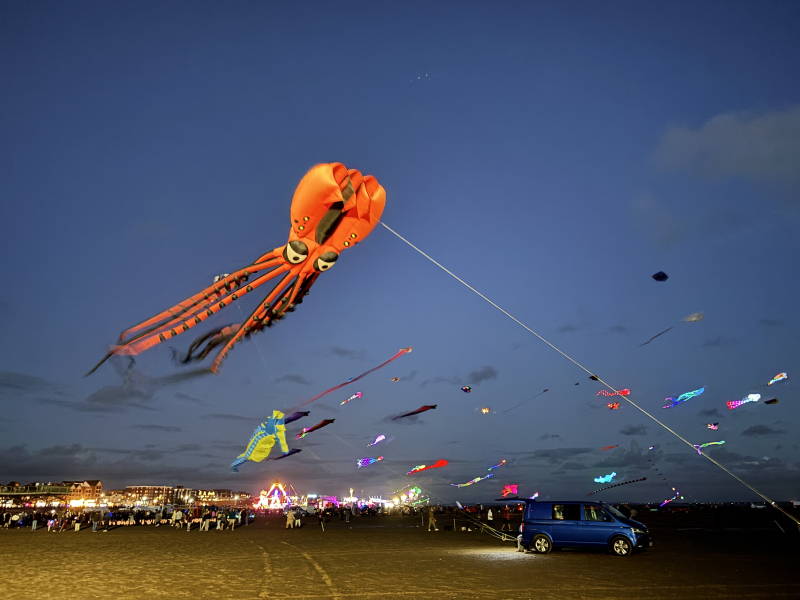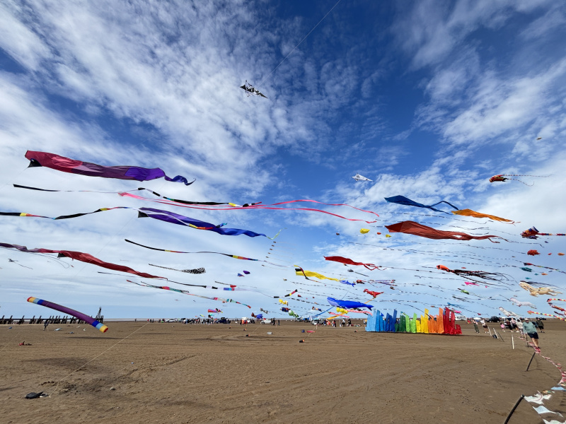 Organised by SmileFactor10, the St Anne’s International Kite Festival was held on the 29th, 30th and 31st August 2025. The festival will be remembered not just for how windy, and at times wet it was, but for the fantastic efforts of the fliers. We arrived at midday on the Friday shortly after a heavy downpour and therefore the beach looked like the tide had come in. For many, plans changed in terms of kites being flown due to the ground conditions and wind strength. When it came to the night flight the sky was filled with LED lit kites as well as some lit by the strong floodlights. Another great night fly.