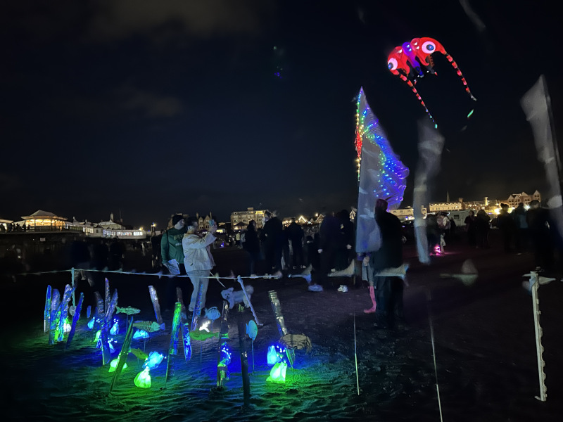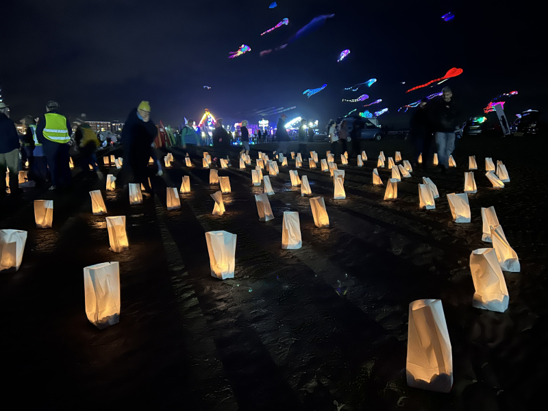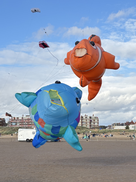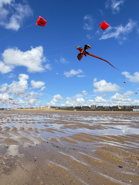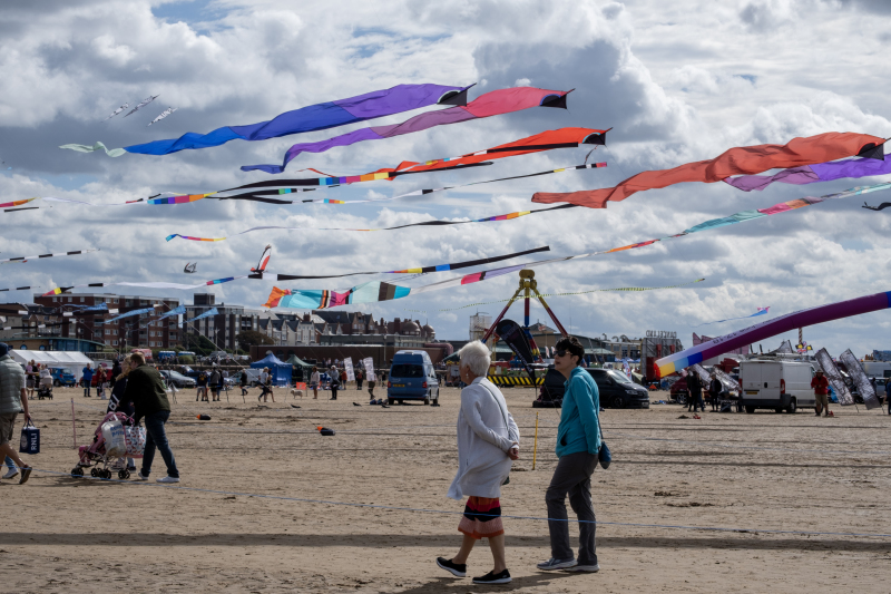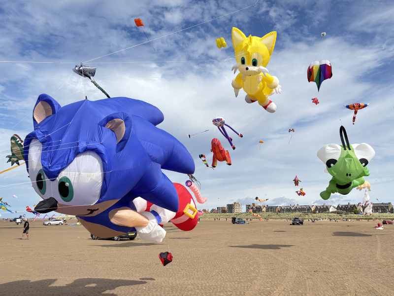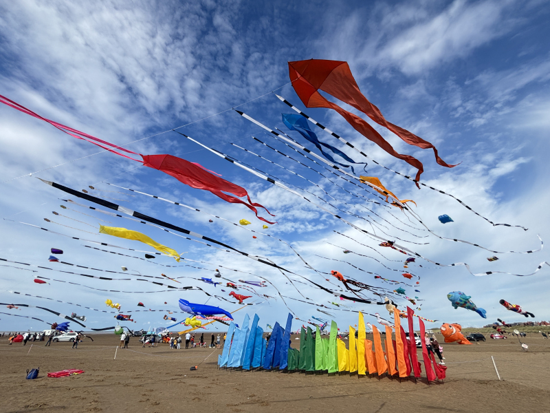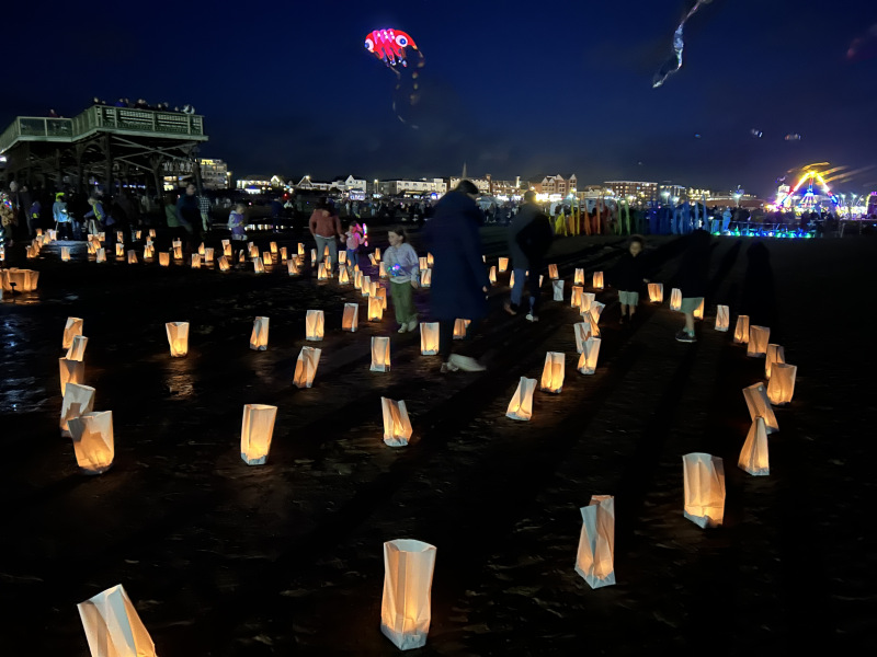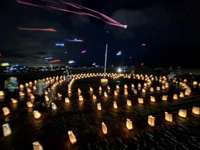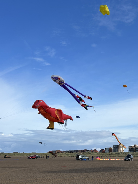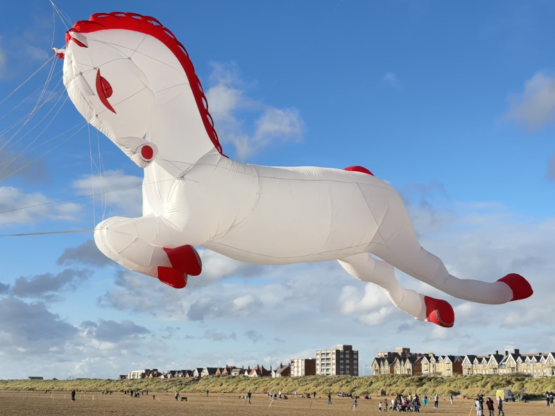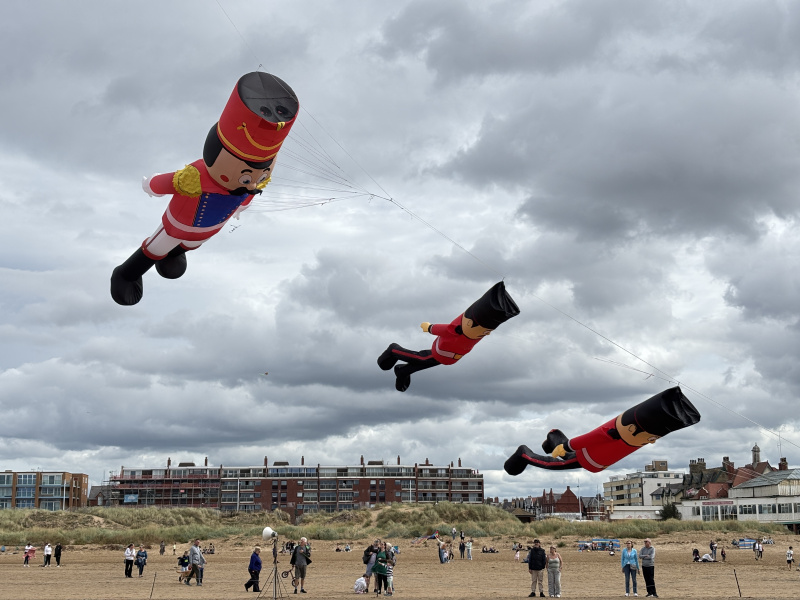 Organised by SmileFactor10, the St Anne’s International Kite Festival was held on the 29th, 30th and 31st August 2025. The festival will be remembered not just for how windy, and at times wet it was, but for the fantastic efforts of the fliers. We arrived at midday on the Friday shortly after a heavy downpour and therefore the beach looked like the tide had come in. For many, plans changed in terms of kites being flown due to the ground conditions and wind strength. When it came to the night flight the sky was filled with LED lit kites as well as some lit by the strong floodlights. Another great night fly.